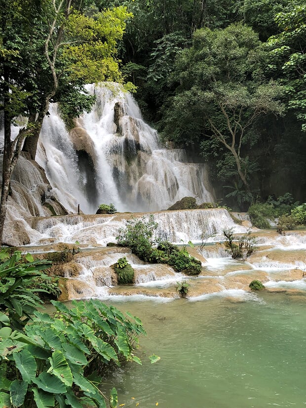 Das Highlight in der Gegend sind sicherlich die Kuang-Si-Wasserfälle, die wir tags darauf mit einer Wanderung erklommen und betrachten konnten. Das Schwimmen im kalten Wasser auf der zweiten Ebene der Wasserfälle war ein tolles Erlebnis, zumal hier für einen Moment von ein paar Minuten einmal keine weiteren Touristen waren und wir den Platz ganz für uns genießen durften. Ein Geschenk! Am Abend betrachteten wir vom höchsten Punkt der Stadt aus den Sonnenuntergang- da dies vielen Touristen als Must-See gesagt wird, ist allerdings eine idyllische Atmosphäre nicht zu erwarten.