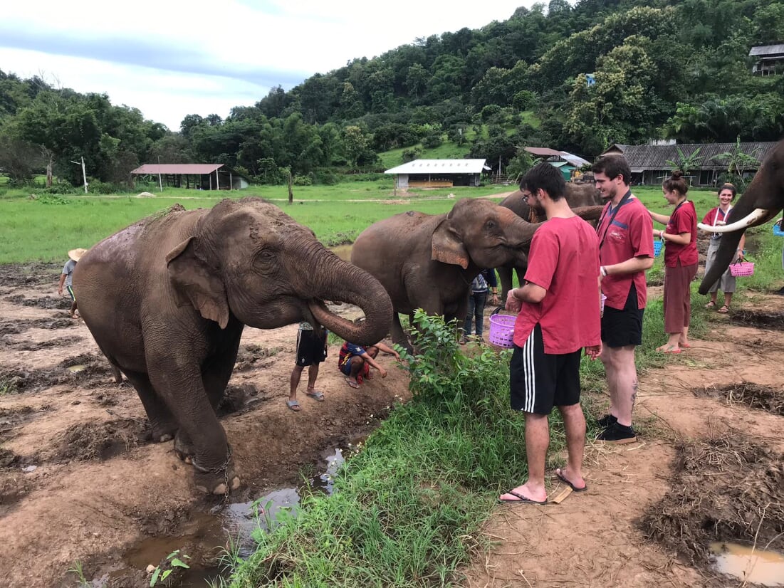 Wir überquerten die Grenze nach Thailand und kamen, nach einer Übernachtung in Chiang Khong, am nächsten Morgen nach Chiang Rai, wo wir den beeindruckendsten Tempel der ganzen Reise anschauen durften: den White Tempel! Wie aus einem Märchenfilm glitzert der Tempel in strahlendem Weiß und bescherte uns eindrucksvolle Momente voller Staunen. Das war jedoch nur eine Zwischenstation auf dem Weg nach Chiang Mai (8), wo die Gruppe noch einen letzten gemeinsamen Tag verbringen durfte. Wehmütig dachten schon alle an den bevorstehenden Abschied, aber zuvor machten wir noch einen Ausflug in ein Rescue Center für Elefanten, die aus schlechten Haltungsbedingungen gerettet wurde. Füttern, einschlammen und baden stand auf dem Programm und sorgte für einen Heidenspaß mit den Tieren!